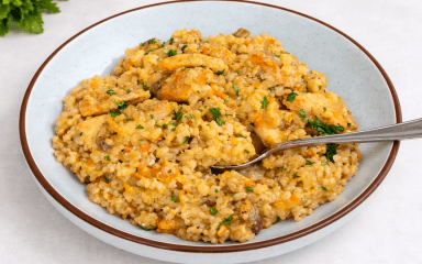 Страва виходить густою, м’якою й добре збалансованою, перловка не суха і курка залишається соковитою.