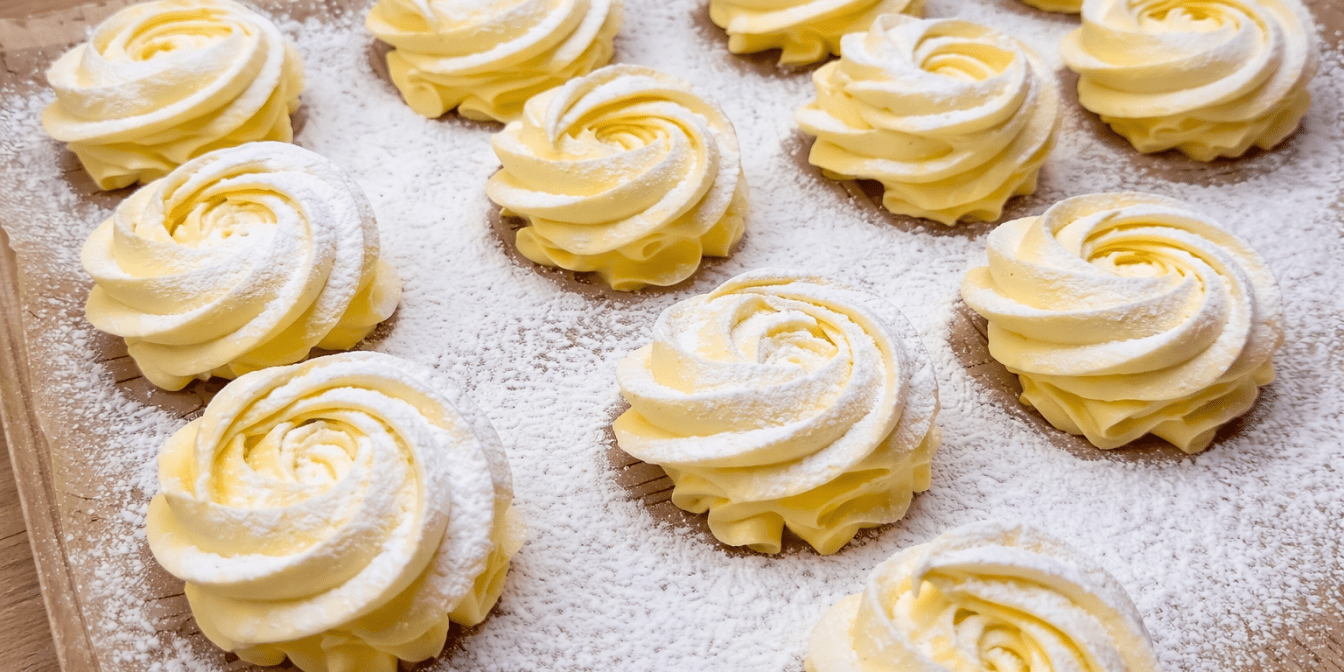Переклади зефірну масу в кондитерський мішок із насадкою, відсади половинки на пергамент. Залиш у сухому приміщенні на 4–8 годин до стабілізації. Готовий зефір посип сумішшю пудри з крохмалем і з’єднай половинки.