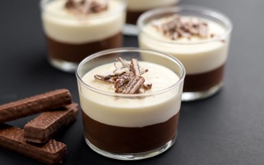 В цьому десерті поєднаємо чорний і білий шоколад. Порадимо взяти чорний шоколад з високим вмістом какао. Збиті із цукром вершки розділимо на дві частини. Більшу додаємо до білої маси, решту — до темної.