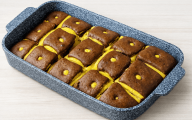 Чіткий візерунок та мʼякість основи пирога тримаються на правильній консистенції: шоколадна маса має легко розтікатися, а сирна залишатися щільною. Саме тому важливо не пропускати крок з додаванням крохмалю в сирний шар. Прикрасити можна ягодами чи цукровою пудрою.