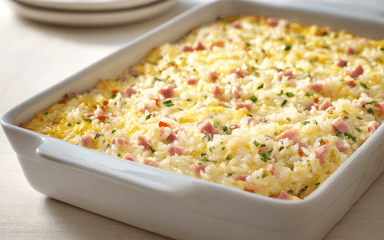 Пиріг без тіста з рисом і шинкою — готуємо в сковороді або духовці