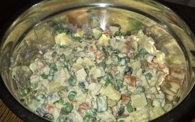 І ще одна варіація оригінального рецепта олів’є від Валерії Сидоренко. Вона пропонує додати в салат варений корінь овочу, куряче філе та заправити олів’є із селерою безлактозною сметаною.