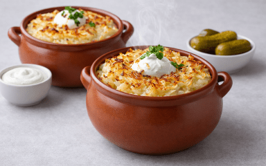 Готову картопляну бабку подавай у горщиках, а зверху порадимо додати трохи сметани. А ще дізнайся, як готують картопляну бабку на Хмельниччині, буде смачно!