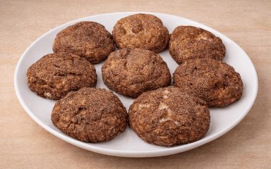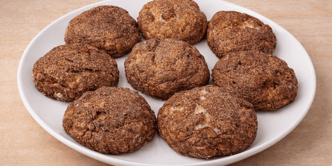 Відщипуй тісто порціями по 35–40 г, формуй кульки, щедро обвалюй у цукрово-коричній суміші, злегка приплюсни. Виклади на деко з пергаментом, залишай між печивом 3–4 см.