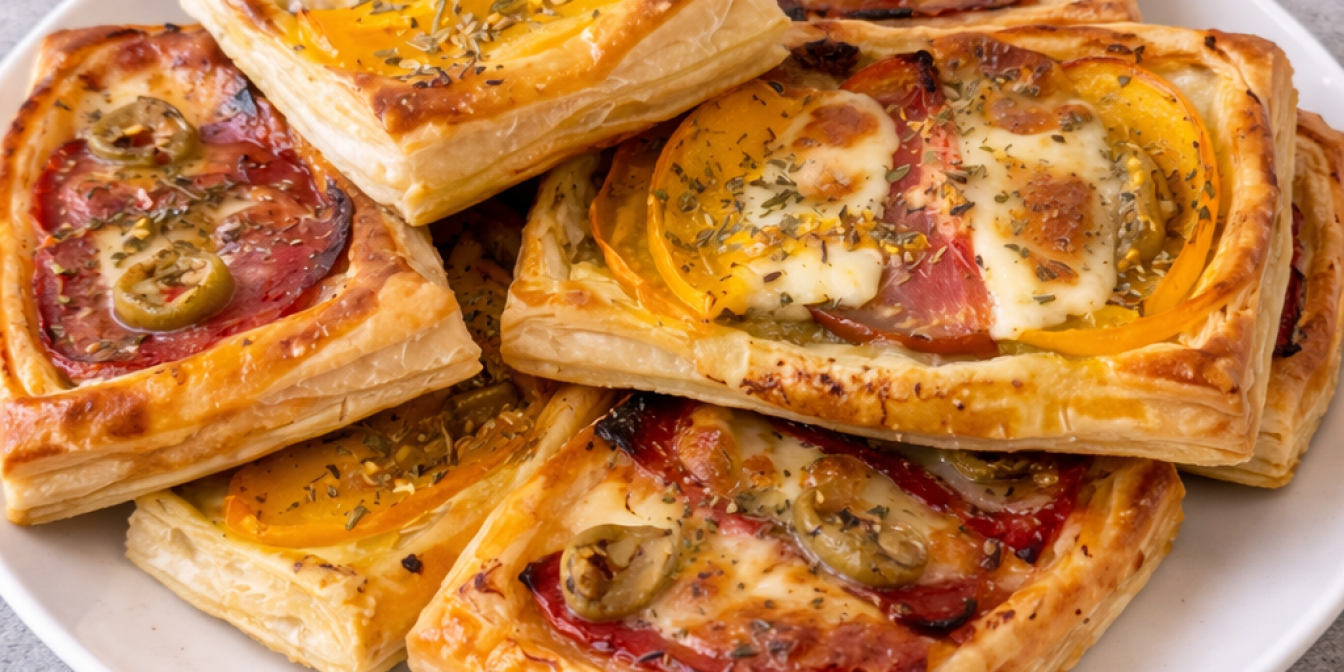 Виклади слойки на деко з пергаментом. Запікай у розігрітій до 200 °C духовці 14–16 хвилин до золотистого кольору. Дай постояти 2–3 хвилини перед подачею.
