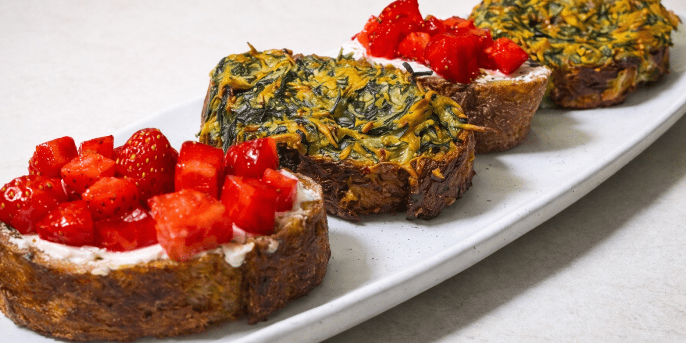 Гречаний багет тут основа: він має горіхову нотку, яка точно підійде і під солоні, і під солодкі поєднання. Солодка версія готується лише 5 хвилин: намазати крем-сир, порізати полуницю й полити медом. А яєчно-сирна більше схожа на грінки, бо запікається в духовці до легкого хрумкоту.