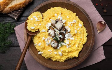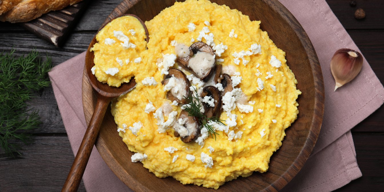 Якщо любиш банош і поленту, спробуй цю кукурудзяну кашу з грибами та сиром. Для її приготування крупу варимо на молоці до кремової консистенції, а потім поєднуємо з печерицями та кисломолочним сиром.