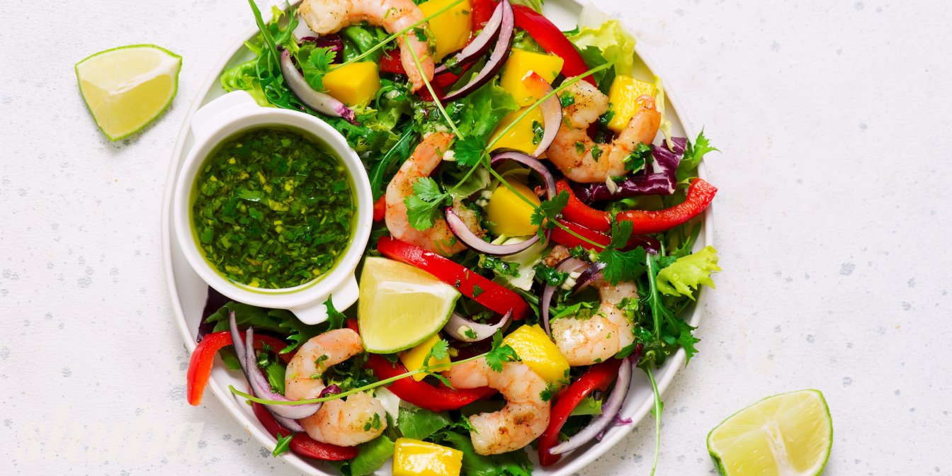 Салат із креветками й манго поєднує соковиту солодкість фруктів, хрумкі овочі та теплі обсмажені морепродукти. А лаймова заправка з медом та кінзою додасть страві яскравої кислинки. Цей теплий салат можна подавати до святкового столу.