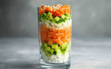 Це будуть ліниві суші, які не треба загортати, а всі інгредієнти викладаємо в склянки. Спочатку замаринуємо лосось або іншу червону рибу, одночасно зваримо рис. Прикрашаємо або кунжутом, або червоною ікрою.