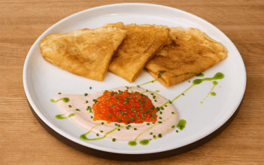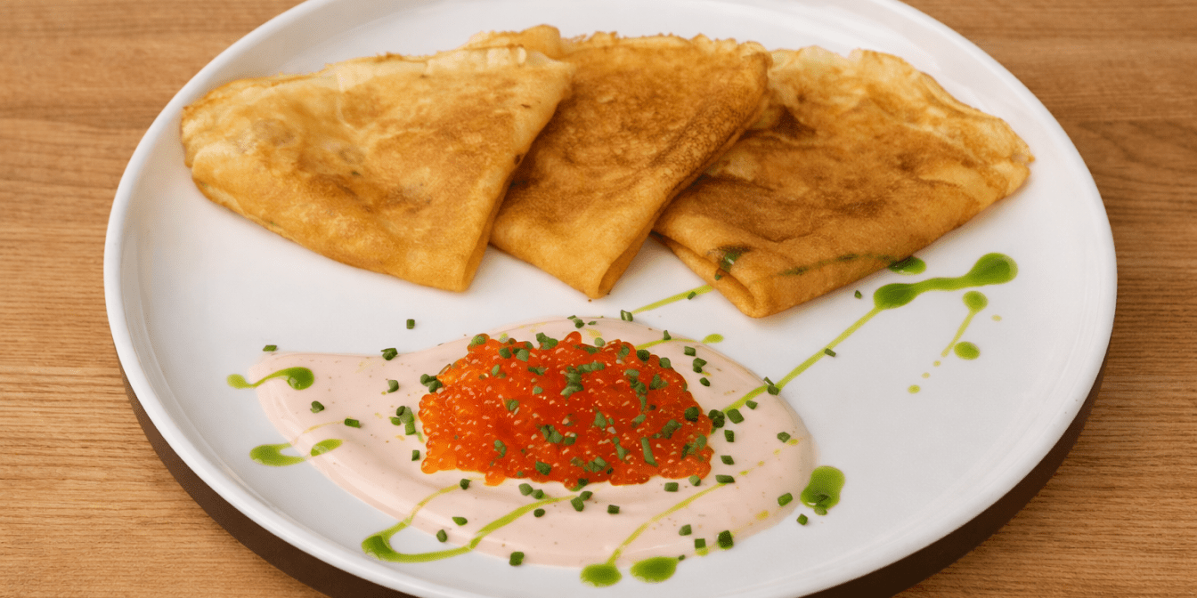 Вітамінні млинці з сочевиці з копченою сметаною та ікрою — це корисний та яскравий рецепт, який додасть твоїм класичним млинцям трохи кольору та цікавої подачі. Сочевиця надає ніжної кремової текстури та легкого горіхового відтінку, куркума — апетитного золотистого кольору, а копчена сметана з ікрою перетворюють сніданок на ресторанну страву.