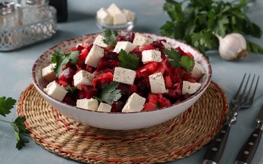 Цей салат збирається за лічені хвилини. Буряк, фіолетова цибуля, фета, горіхи й лимонна заправка створюють вдале поєднання для пікантного й свіжого смаку. Скористайся покроковим рецептом, і за 20 хвилин твій салат буде готовим!
