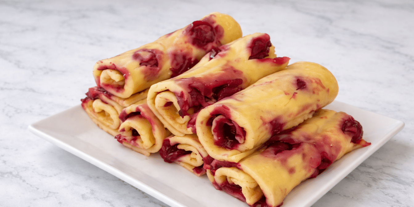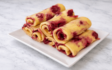 Запікання — дуже зручний спосіб приготування млинців. Випікаєш один великий, який потім легко нарізається й скручується в рулетики. Текстура виходить трохи іншою, ніж у класичних млинців, більш повітряною та м’якою, майже як у тонкого бісквіта.