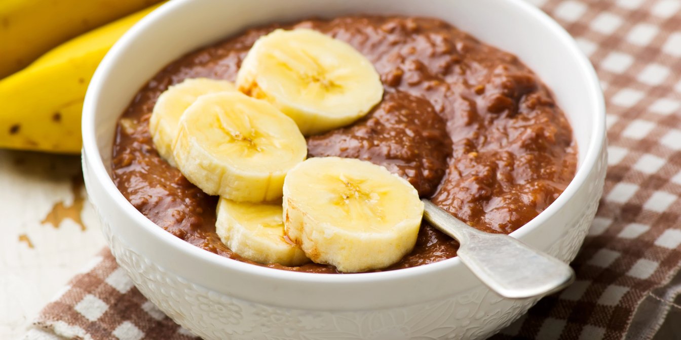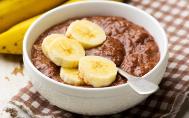 У цьому варіанті основою є звичайна вівсяна каша на воді, яку доповнюють густим шоколадним топінгом. Солодкість забезпечують фініки та стиглий банан, а какао-порошок додає виразного смаку без використання готових сиропів чи рафінованого цукру.