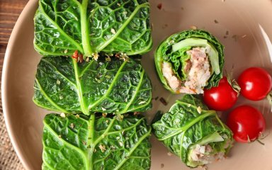 Рулет з червоною рибою та яйцем у капусті — це швидкий рецепт свіжої і ситної закуски без тіста та зайвої важкості. Ніжний крем-сир, солонувата риба, м’яке яйце та хрусткий лист капусти створюють збалансований смак. Страва готується буквально за кілька хвилин, її зручно брати з собою або їсти одразу.