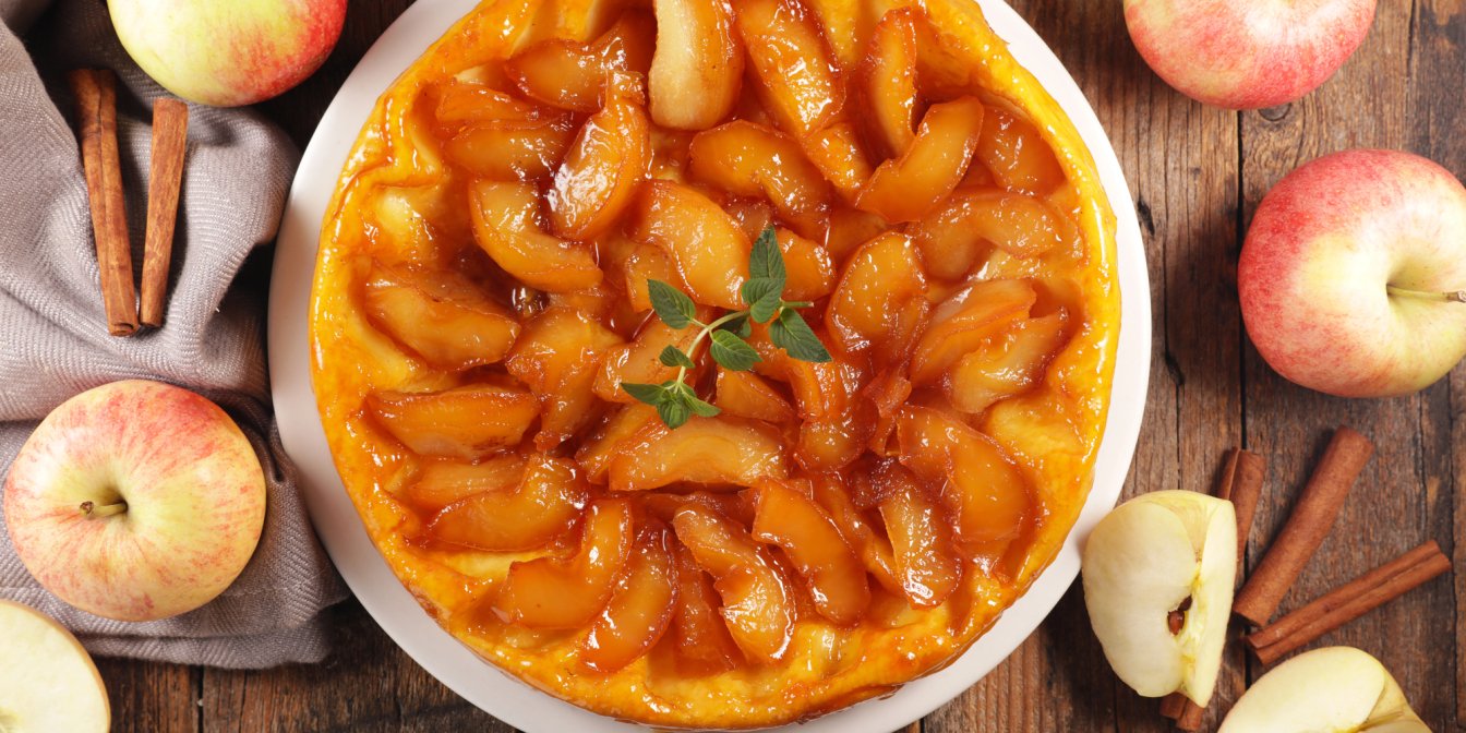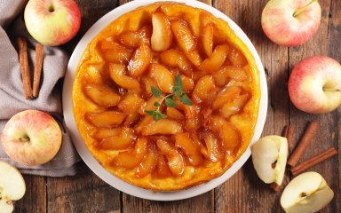 Такий перевернутий пиріг з яблуками має вологу серединку й виражену зернисту структуру.