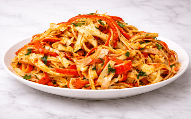 Швидко і просто — саме так готують практично всі закуски з крабовими паличками. Для «Мавки» наріжемо їх на смужки, а потім кожну розберемо на волокна. Закуска має вигляд «спагеті» в ароматному соусі.