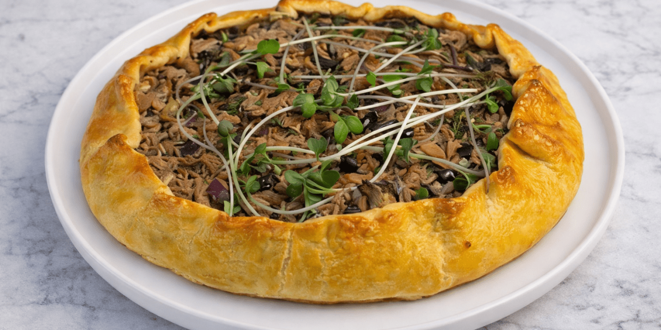 Підверни краї галети до центру та сформуй відкриту форму. Змасти краї жовтком і випікай при 190 °C 30–35 хвилин до золотистої скоринки.