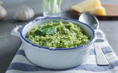У цьому яскравому варіанті класичної італійської страви рис поступово готується в бульйоні, а наприкінці змішується з ніжним пюре зі шпинату й петрушки. Готове ризото зі шпинатом і лимоном доповнюємо хрумкими скибками прошуто, лимонною цедрою і пармезаном, що створює баланс кремової текстури та свіжого цитрусового смаку.