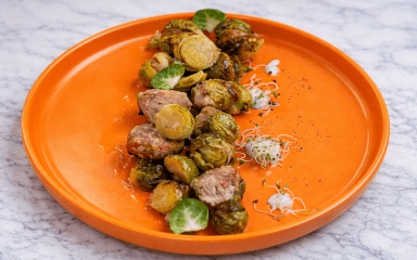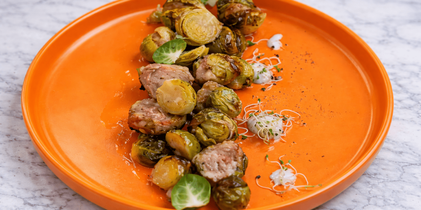 Брюссельська капуста добре поєднується з м’ясом, а запікання допомагає зробити її ніжною та менш гіркою. У цьому рецепті половинки капусти наче фарширують м’ясними кульками, тому страва виглядає цікаво і незвично.