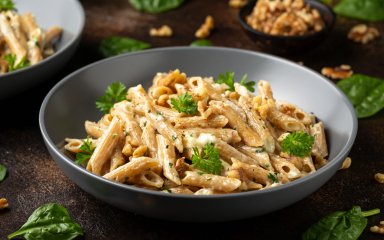 Додай пасту та шпинат до соусу, перемішай до рівномірного покриття. Подавай страву гарячою.