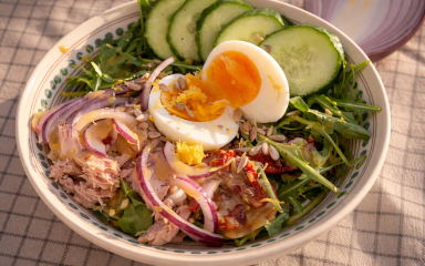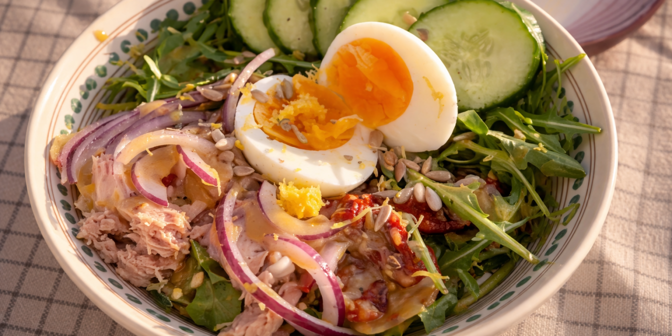 Боул — це поживна страва, у якій різні інгредієнти подаються разом в одній глибокій тарілці. Зазвичай в основі є крупа, до якої додають білок, овочі та соус. Сьогодні готуємо середземноморський боул, поєднуючи тунець, вʼялені томати, яйця, руколу та спеції.