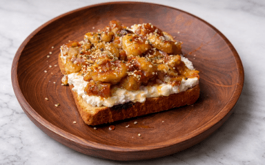 Намаж сир на теплий хліб, виклади карамелізовані банани. Полий медом і посип горіхами та насінням.