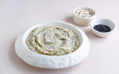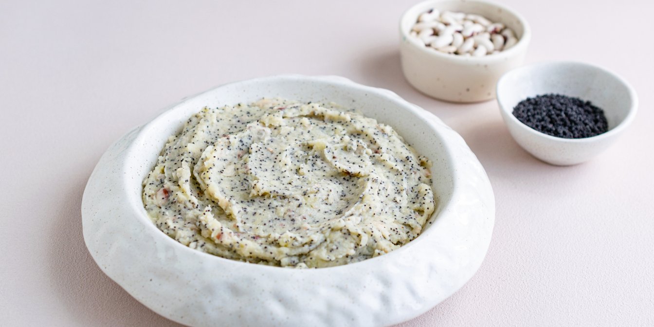 До гарячої картоплі додай квасолю, мак і вершкове масло. Поперчи за смаком.