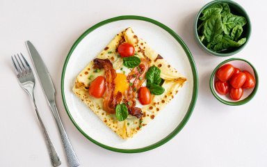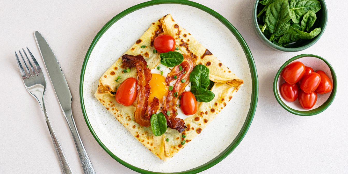 Галета з яйцем і беконом — одна з найпопулярніших варіацій. Таке поєднання створює ідеальний баланс текстур: хрусткий бекон, м’яка галета, соковиті томати та ніжний соус.