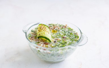 Вимий огірки, за потреби очисти від грубої шкірки. Половину овочів натри на великій тертці, іншу — наріж дрібними кубиками, щоб зробити текстуру супу цікавішою. Злегка посоли огірки й залиш на 10 хвилин, щоб вони пустили сік.