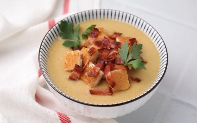 Суп із сочевиці та бекону — це густа перша страва на курячому бульйоні. Суп готується з бобових, овочів і м’яса, його можна подавати одразу або зберігати в холодильнику кілька днів. Любителі крем-супів можуть частково перебити його блендером.