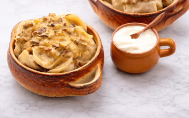 Обсмажені печериці з цибулею ідеально доповнюють пельмені з будь-яким м’ясом. Буде смачно й з варениками з квашеною капустою або варениками з картоплею і сиром.