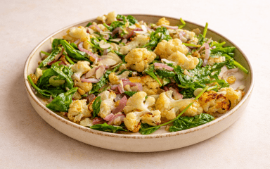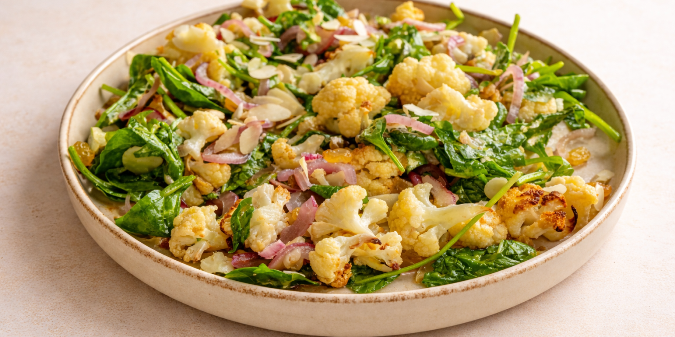 - Перед тим як ставити теплий салат з цвітною капустою на стіл, дай йому настоятися 2-3 хвилини. Так шпинат пом'якшиться під впливом тепла капусти.
