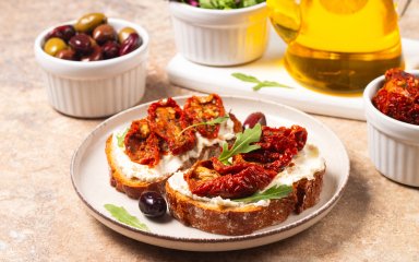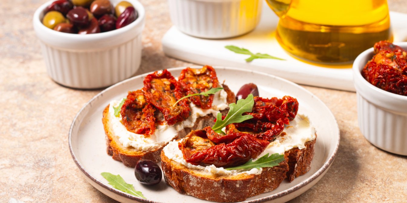 Наріж в’ялені помідори тонкими смужками. Виклади їх на сир, додай трохи олії з-під помідорів для аромату.