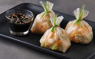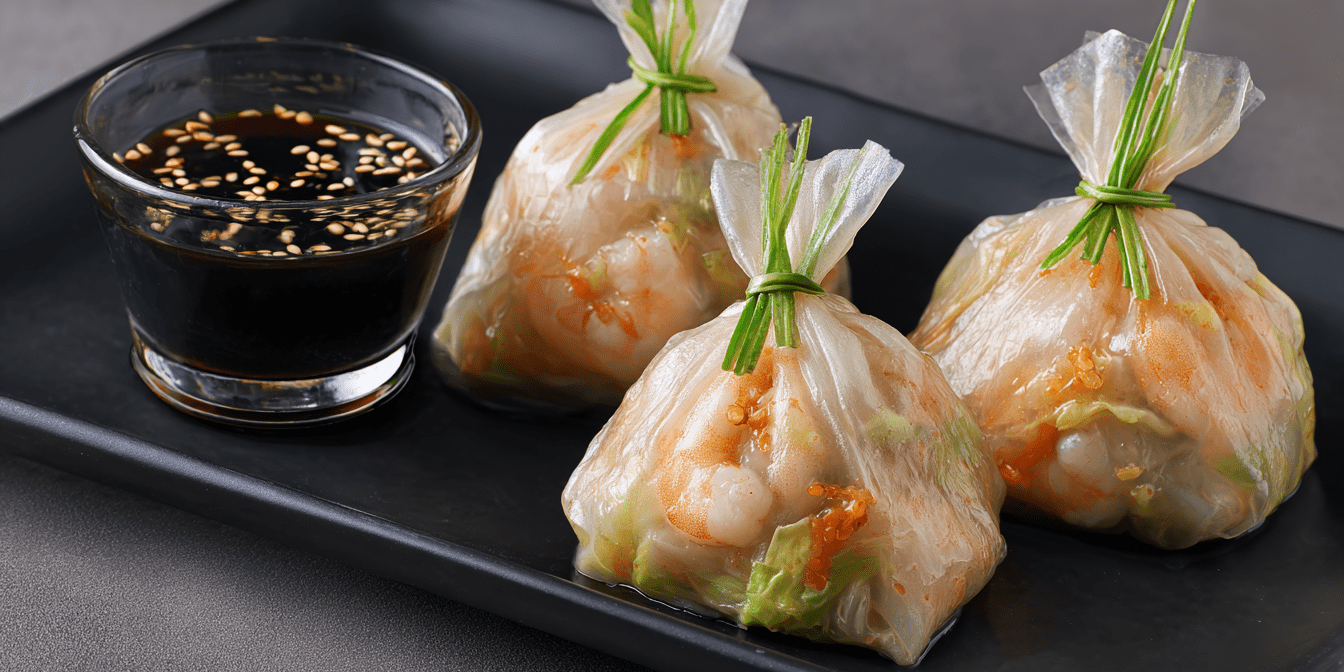 Дієтичні дімсами — це легкий варіант закуски азійської кухні без тіста у класичному розумінні. Рисові листи створюють ніжну майже прозору оболонку, а соковита начинка з креветок і овочів дає яскравий смак. Завершує страву ароматний соєвий соус із цитрусовою ноткою.