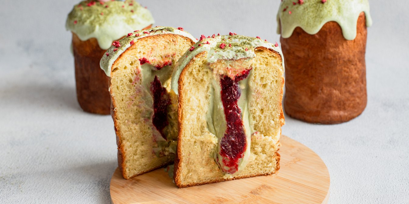 Паска з матчею і малиною — це сучасний рецепт святкової випічки з ніжною текстурою та яскравою начинкою всередині. Паска на дріжджовому тісті з ромом випікається до легкої скоринки, а потім наповнюється матча-кремом і малиновим конфі.