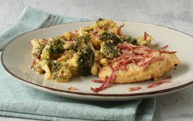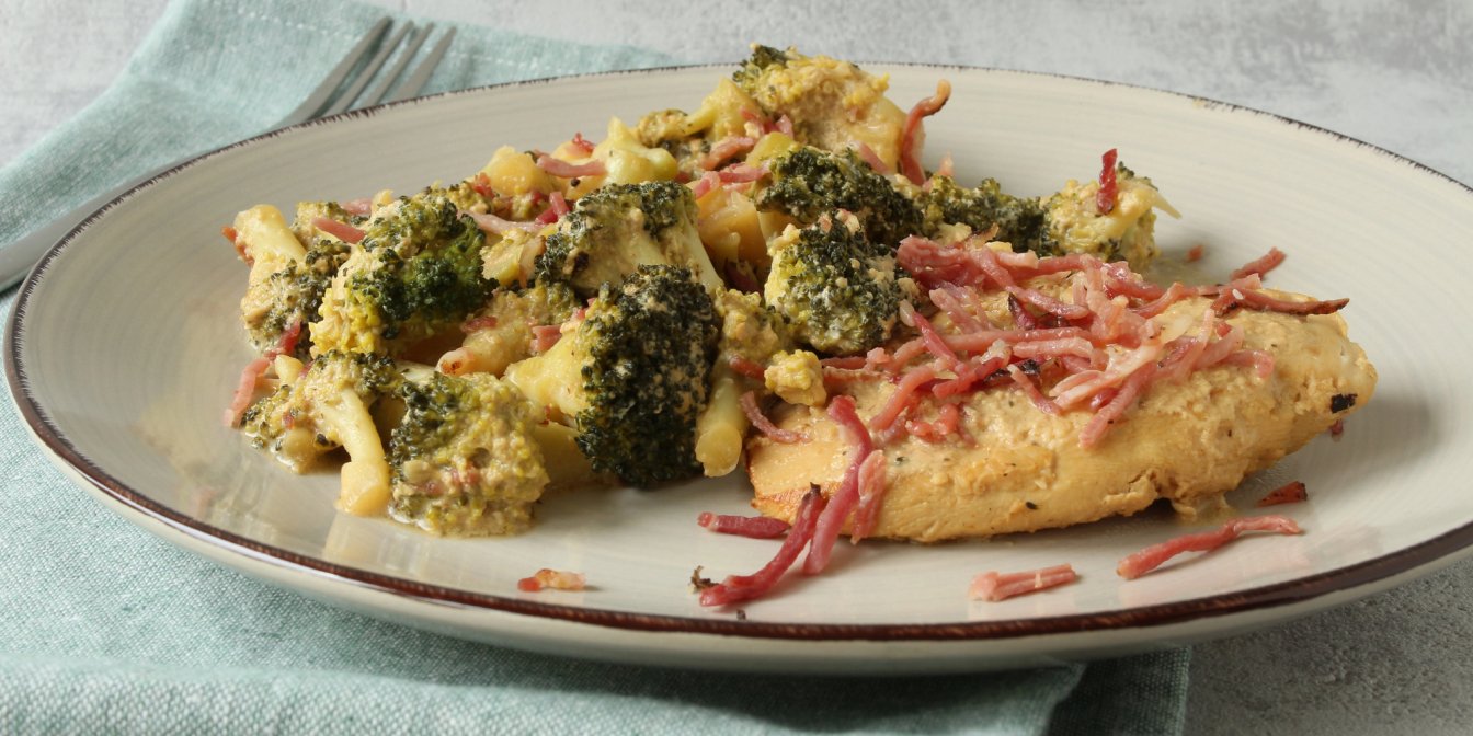 Запечена курка з броколі, сиром та беконом — ситна вечеря в одній формі