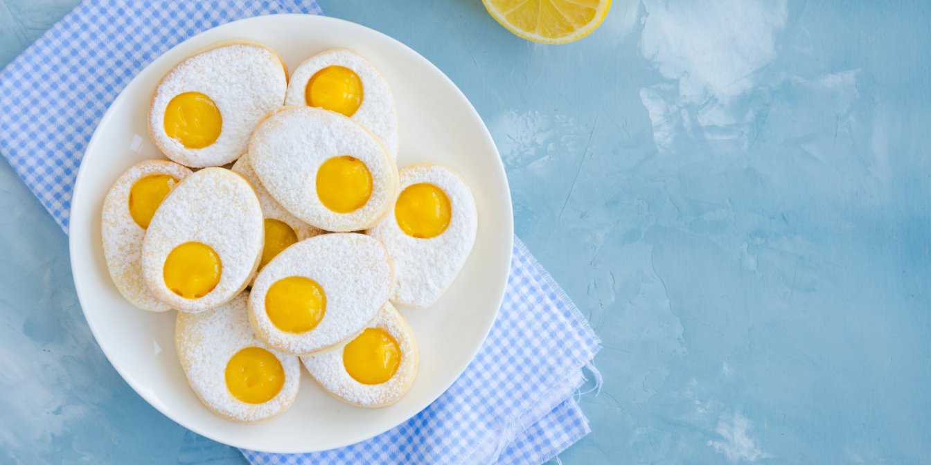 Йдеться про sunny-side-up cookies — пісочне печиво у формі смаженого яйця з яскравою серединкою у вигляді жовтка. Американський Allrecipes пропонує версію з лимонно-мигдальним тістом і лимонним курдом, Sugar Spun Run — пісочне печиво із джемом жовтогарячого кольору, Plated Cravings — печиво з лимонним курдом та лимонним айсингом. Підходить будь-яка начинка, що кольором схожа на жовток.