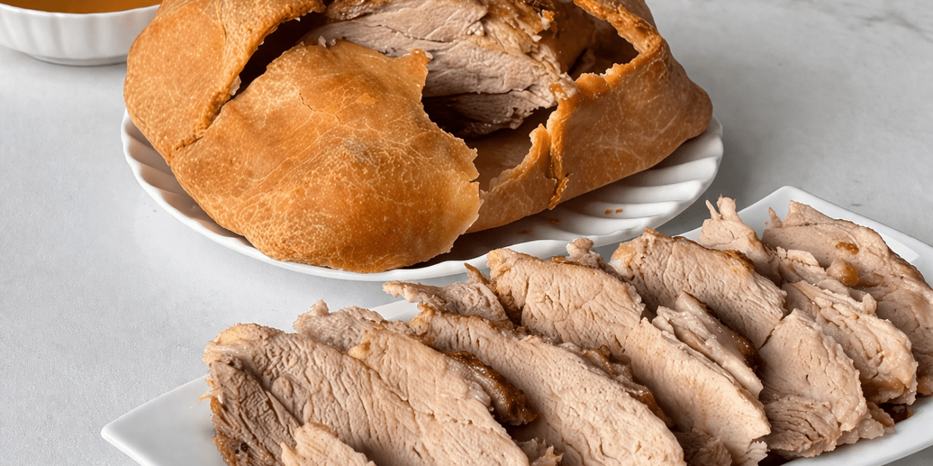 Це мʼясо готується не швидко, але смак та ніжна структура точно того варті. Спочатку свинину вимочуємо в розсолі, насичуючи її вологою і спеціями. Потім запікаємо в тісті, яке не дає соку випаровуватись. Під час запікання всередині утворюється бульйон. Після випікання його можна злити і ти отримаєш ніжну запечену свинину, яка буквально розпадається на волокна.