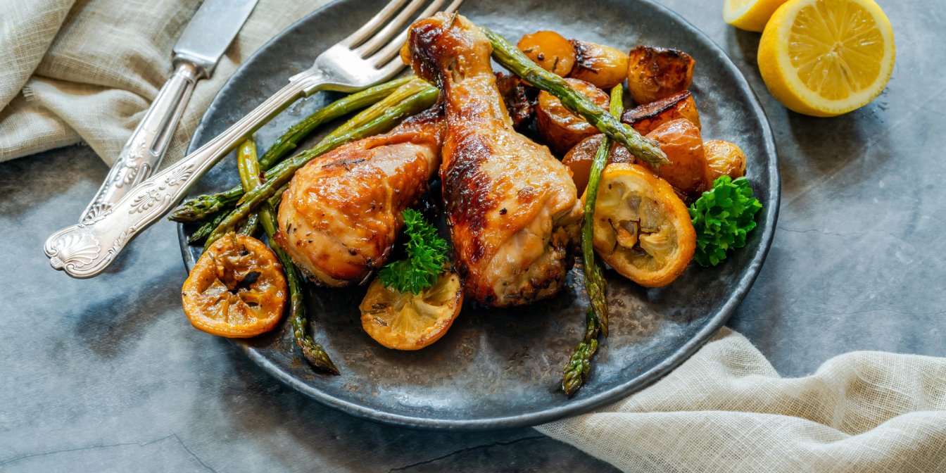 Запечена курка з картоплею та спаржею — рецепт ситної вечері з духовки