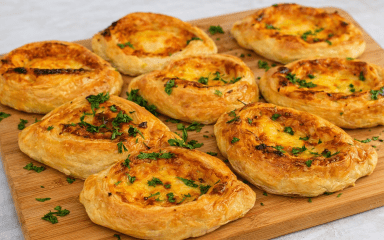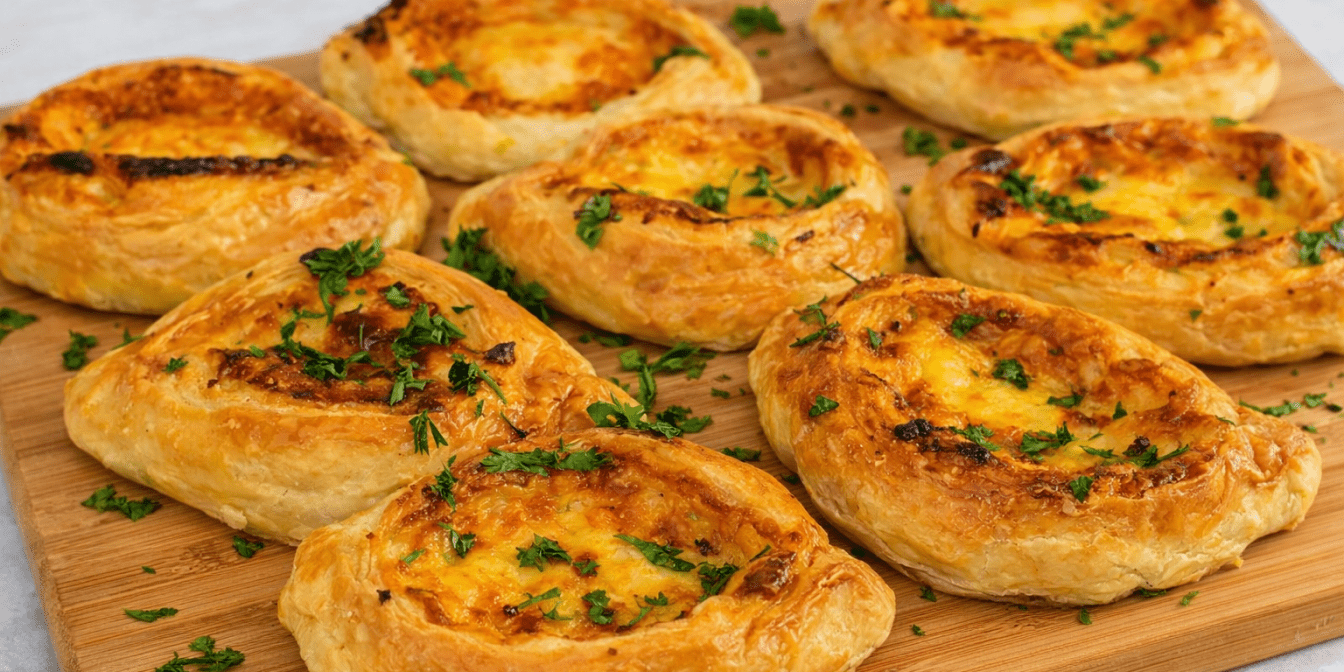 Хрустке листкове тісто розкривається шарами, а всередині тягнеться розплавлена моцарела з легкою кислинкою томатного песто. Начинка залишається соковитою, а краї — рум’яними й повітряними. Спробуй приготувати ці відкриті пиріжки з сиром з листкового тіста, коли хочеться чогось швидкого, але домашнього.