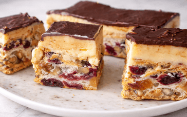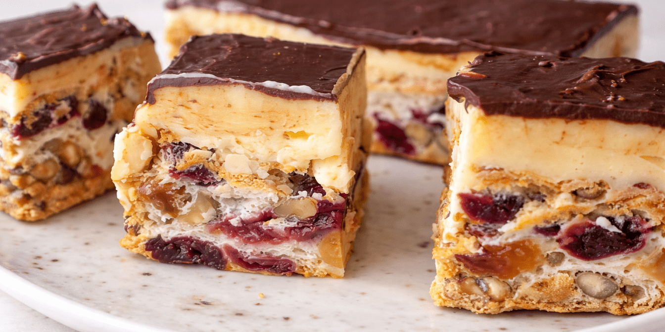 Пляцок «Асорті» з білків та горіхів — це чудовий спосіб використати білки, які залишилися після інших десертів. Основа готується саме з них, а ще горіхів, родзинок і вишень, тому корж виходить ніжним, трохи повітряним і водночас вологим. Після випікання він має незвичну текстуру — м’яку, майже як вата, але при цьому добре тримає форму. Зверху корж покривають масляним кремом на цукровому сиропі та шоколадною глазур’ю, що робить пляцок насиченим і святковим.