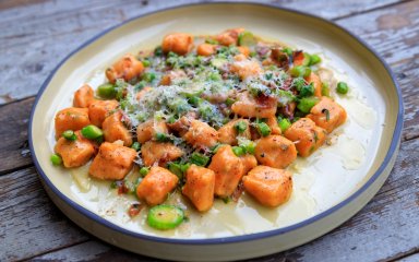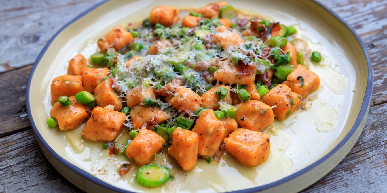 Рецепт ньокі з батату зі спаржею та беконом