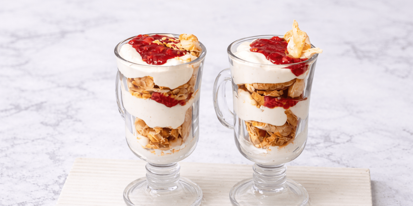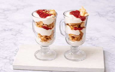 Листкові коржі поламай на середні шматки. Виклади перший шар крихти по склянках, промасти кремом і додай трохи соусу. Повтори, щоб отримати декілька шарів.