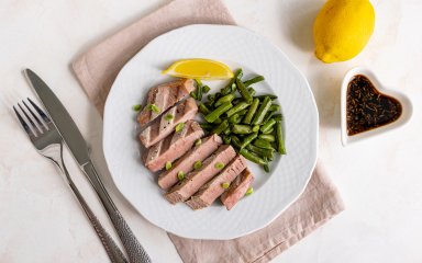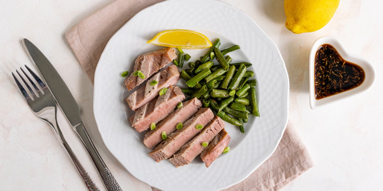 Переклади тунець на тарілку, додай квасолю і скибку лимона. Наріж рибу на порційні шматочки, полий цитрусово-імбирним соусом або подай його окремо як діп. Прикрась страву дрібно нарізаною зеленою цибулею.
