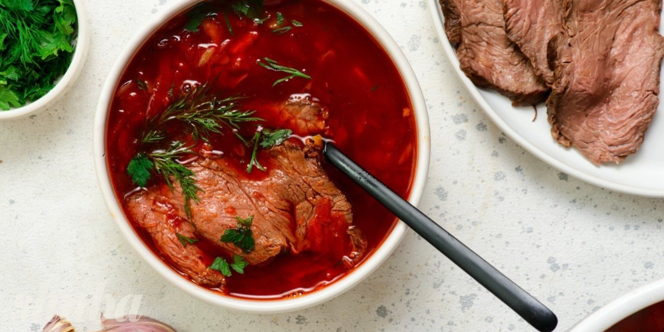 Борщ із ростбіфом — насичений яловичий бульйон із соковитим м’ясом