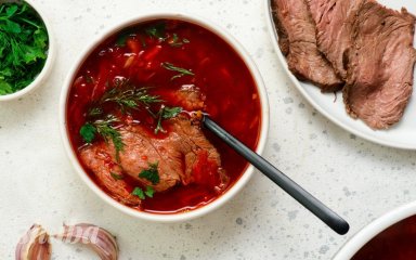 Борщ із ростбіфом — це варіація класичного рецепта, де замість вареного м’яса будуть шматочки ароматної запеченої яловичини. Спочатку готується насичений бульйон на кістці, який вже має яскраву основу, а в кінці додається ще й тонко нарізаний ростбіф. Завдяки цьому м’ясо не переварюється та зберігає соковитість. Овочева частина залишається звичною: буряк дає колір і солодкість, капуста — легку хрумкість, а томатна паста — баланс смаку. Додамо цю страву до нашої добірки найкращих рецептів борщу.