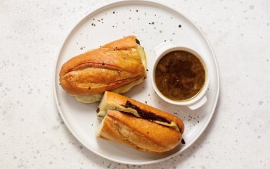 Френч діп-сендвіч — це поєднання хрусткої булочки, соковитого ростбіфа і гарячого м’ясного соусу, в який сендвіч занурюють перед кожним укусом. Спочатку готується насичений яловичий бульйон, який буде основою для ароматного соусу, а м’ясо запікається до ніжної текстури і нарізається тонкими скибками. Булочка підсмажується з маслом, тому ззовні вона хрустка, а всередині вбирає соус. У результаті отримуємо гарячу соковиту закуску з хрумкою скоринкою.