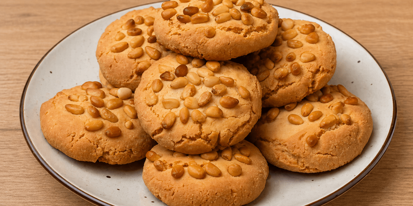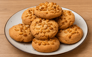 Піньолі — це класичне італійське печиво, яке готують без пшеничного борошна, лише з мигдалевої основи, білків і кедрових горіхів. Зовні воно має тонку хрустку скоринку з горіхів, а всередині залишається м’яким і трохи тягучим. Завдяки мигдалевому борошну смак виходить насиченим, але делікатним, без зайвої солодкості. Під час випікання печиво злегка розтріскується, проте зберігає характерну форму.