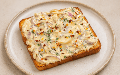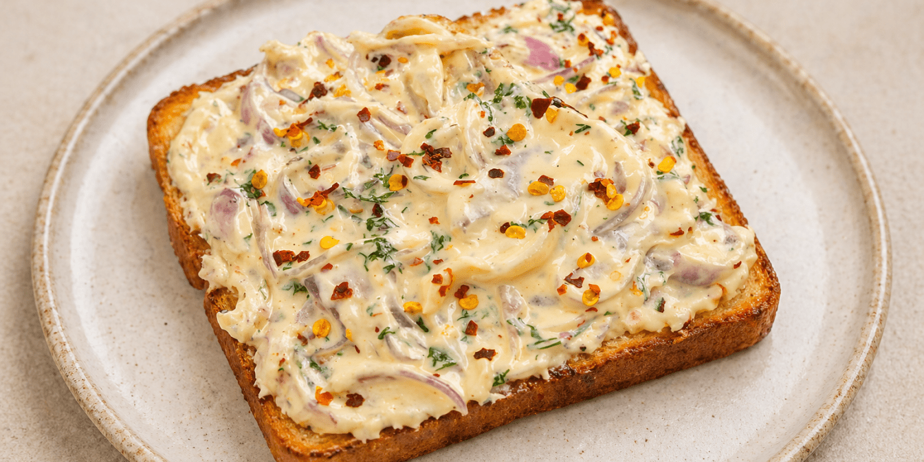 Ароматна намазка з карамелізованої цибулі, вершкового соусу та сиру — це ідеальне поєднання солодкуватої м’якості цибулі, вершкової текстури і насиченого сирного смаку. Під час приготування цибуля поступово розкривається: спочатку стає прозорою, а потім ніжною і трохи карамельною. Молоко і сир перетворюють бутербродну намазку в густий, кремовий соус, який добре тримається на хлібі. А спеції додають легку пікантність, але не перебивають основний смак.