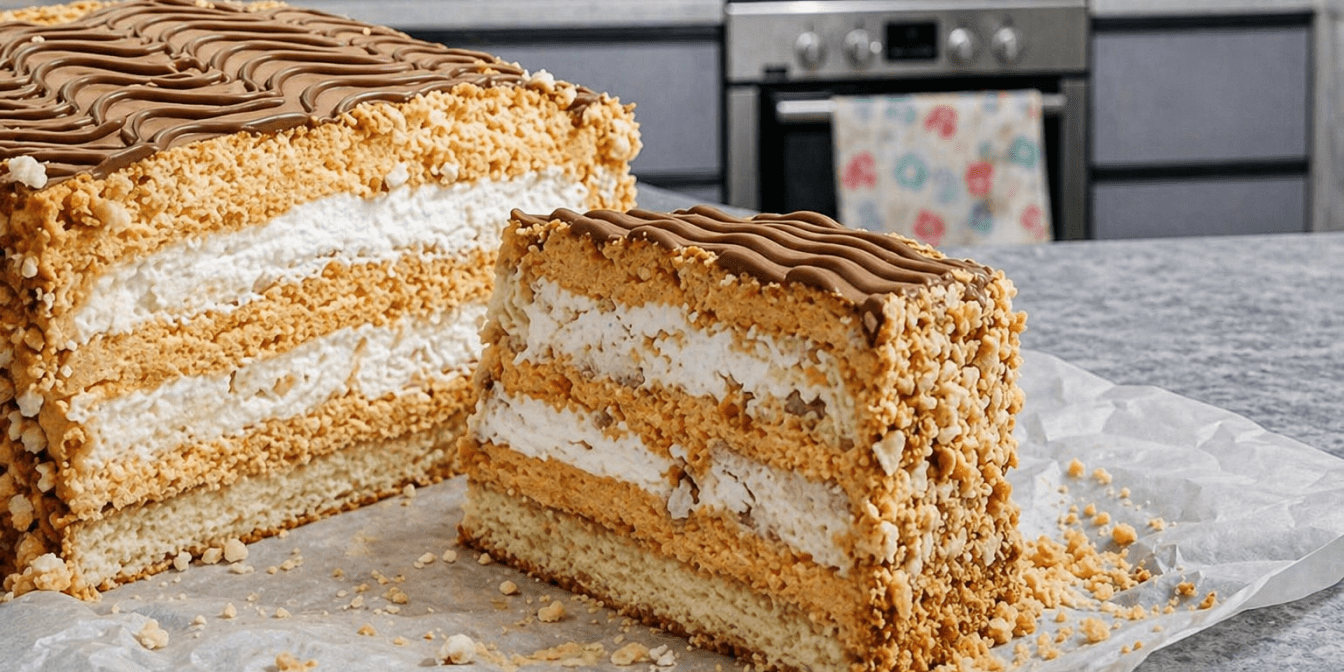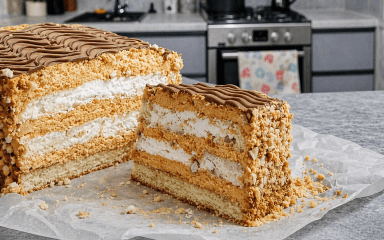 Горіхово‑карамельний торт з вершковим кремом — це ще один рецепт домашнього десерту від Катерини Сімонової. Тут усе максимально знайоме: м’які бісквітні коржі, крем зі згущеного молока і вершкового масла та карамельний прошарок, який додає насиченості. Збирається торт шарами, а зверху покривається кремом, горіхами і простим шоколадним декором. Виходить великий і дуже домашній десерт без складних технік.